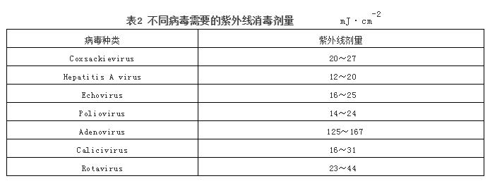 紫外線主要破壞病毒的核酸,也會對病毒的蛋白質外殼產生一定破壞。徐麗梅研究了紫外線對Polioviru病毒的殺滅作用,低劑量的紫外光線能透過病毒蛋白質外殼導致病毒RNA的損傷[33]。波長為254 nm的紫外線照射5 min時,病毒數(shù)量明顯減少,254 nm紫外線照射30 min時,感染細胞內檢測不到病毒粒子。波長為254 nm的紫外線比365 nm的紫外線照射滅活腺病毒氣溶膠的效果更顯著,254 nm紫外線和65 ℃熱力對一些病毒有不同程度的滅活作用,紫外線照射可作為室內空間整體消毒的一種方法。不同病毒需要的紫外線消毒劑量見表2。