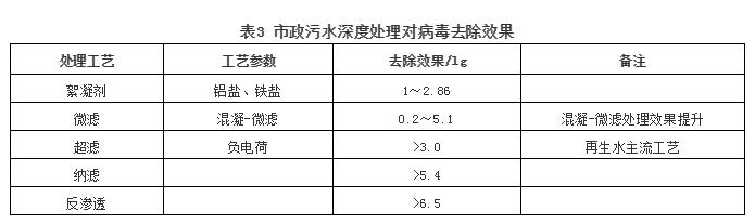 反滲透膜可以看作一種離子級的過濾器,可以過濾掉幾乎所有冠狀病毒和其他絕大多數(shù)病毒,這一點已經在2003年SARS期間在國內再生水廠運行結果得到充分證明。各種市政污水深度處理工藝對病毒的去除能力不同,總結見表3。